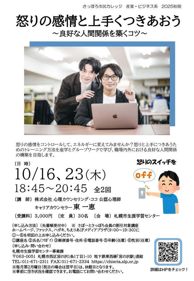 本講座では、怒りと上手につきあうためのトレーニング方法を座学とグループワークで学び、職場内外における良好な人間関係の構築を目指します。良好な人間関係を築き、仕事の効率UPにつなげましょう。