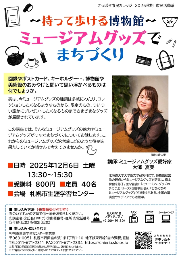 この講座では、そんなミュージアムグッズの魅力やミュージアムグッズがつなぐまちづくりについてお話します。これからのミュージアムグッズが地域にどのような役割を果たしていくか皆さんで考えてみませんか。