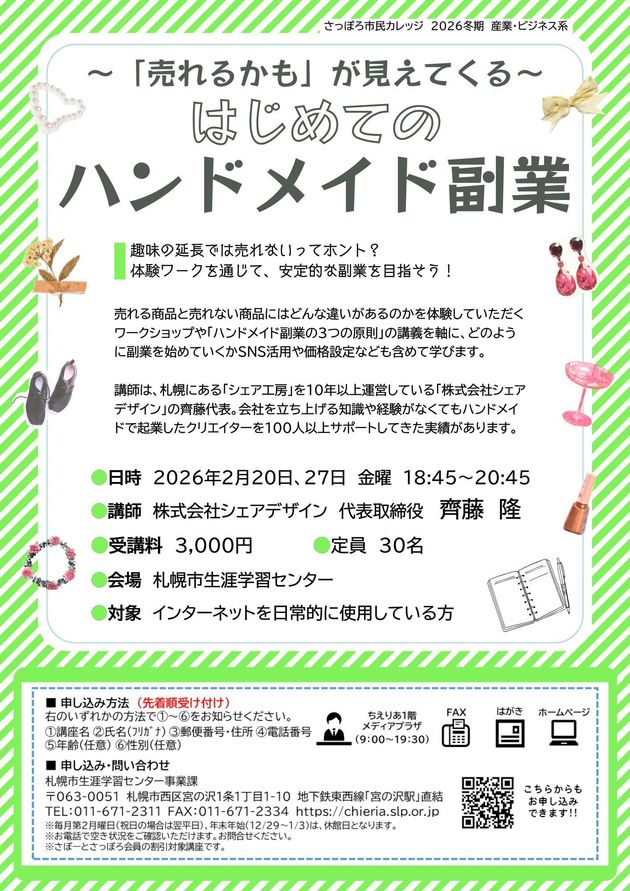 講師は札幌にある「シェア工房」を10年以上運営している株式会社シェアデザインの齊藤代表。会社を立ち上げる知識や経験がなくてもハンドメイドで起業したクリエイターを100人以上サポートしてきた実績があります。商品づくりはもちろん、ファンづくりや利益づくりなど、自分で始めたハンドメイドビジネスを育てていきたいと思っている方におすすめの講座です。