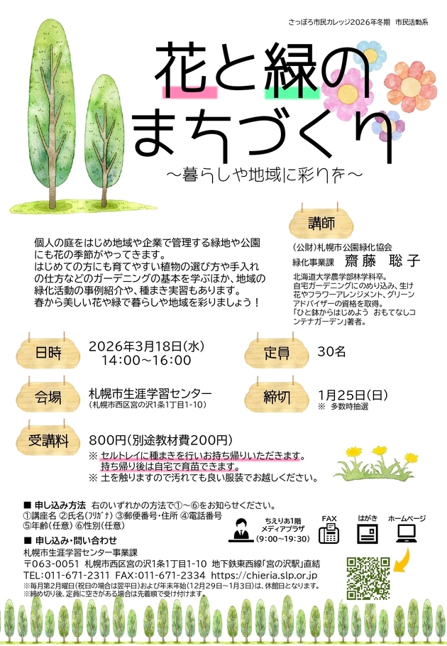 はじめての方にも育てやすい植物の選び方や手入れの仕方などのガーデニングの基本を学ぶほか、地域の緑化活動の事例紹介や、種まき実習もあります。春から美しい花や緑で暮らしや地域を彩りましょう!