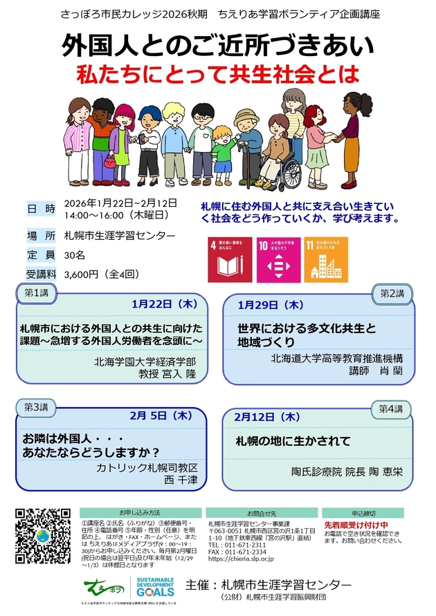 少子高齢化が進むわが国において、高齢者介護などさまざまな社会分野で、私たちの生活を支える外国人住民が急速に増えています。札幌においても同様です。いろいろな文化をもつ外国人住民は、多様性に富んだ新たな活力を私たちに提供してくれます。一方で、言語や文化の違いによる誤解、制度的な支援の不足、地域社会との距離感など、課題を多く抱えているのも現実です。