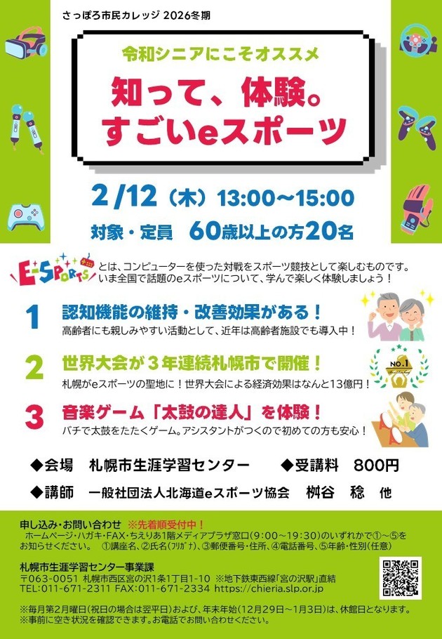 ・eスポーツとは? ・期待される効果と全国の取り組み ・札幌市での活用事例 14:00~15:00 ・eスポーツの体験 |