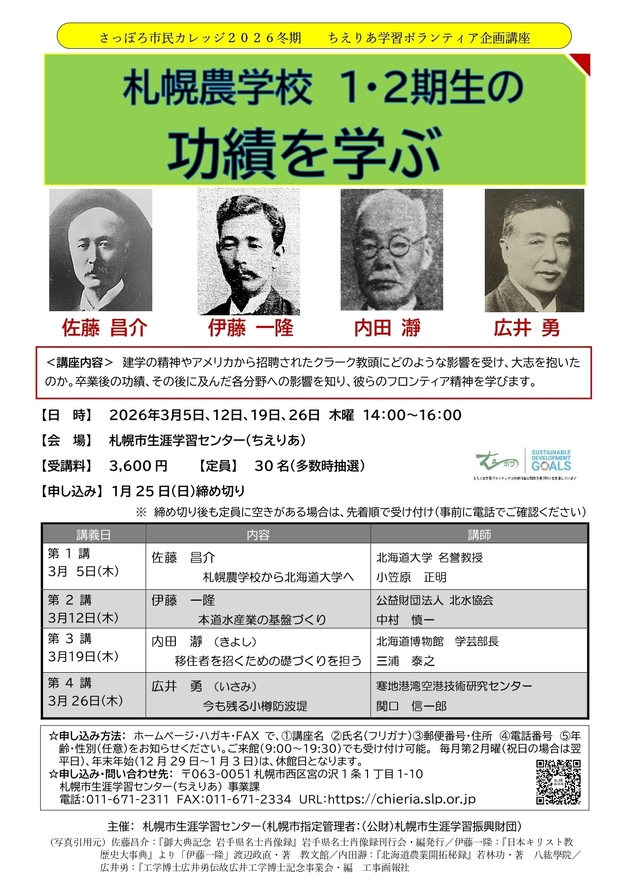 HOME > 講座案内 > 【ちえりあ学習ボランティア企画講座】 札幌農学校1・2期生の功績を学ぶ
